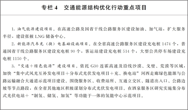 (四)實(shí)施交通能源結構優(yōu)化行動(dòng)。聚焦落實(shí)“雙碳”目標,開(kāi)展“交通+綠色能源”融合發(fā)展模式、實(shí)現路徑及關(guān)鍵技術(shù)研究,打好清潔能源綠色牌,優(yōu)化交通能源結構,促進(jìn)公路貨運節能減排。推進(jìn)高速公路、國省干線(xiàn)服務(wù)區加油(氣)站點(diǎn)加密織網(wǎng),形成油氣供應為主、電氫能源補充替代的交通能源多元互補發(fā)展格局。(省發(fā)展改革委、省交通運輸廳牽頭,省政府國資委按職責分工負責)